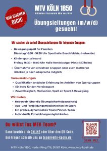 Der MTV Köln 1850 ist Kölns größter Breitensportverein. Wir bringen Menschen in Bewegung, vom Freizeitsport über den Leistungs- und Gesundheitssport bis hin zum Rehabilitationssport, vom Kleinkind bis zum Senior!